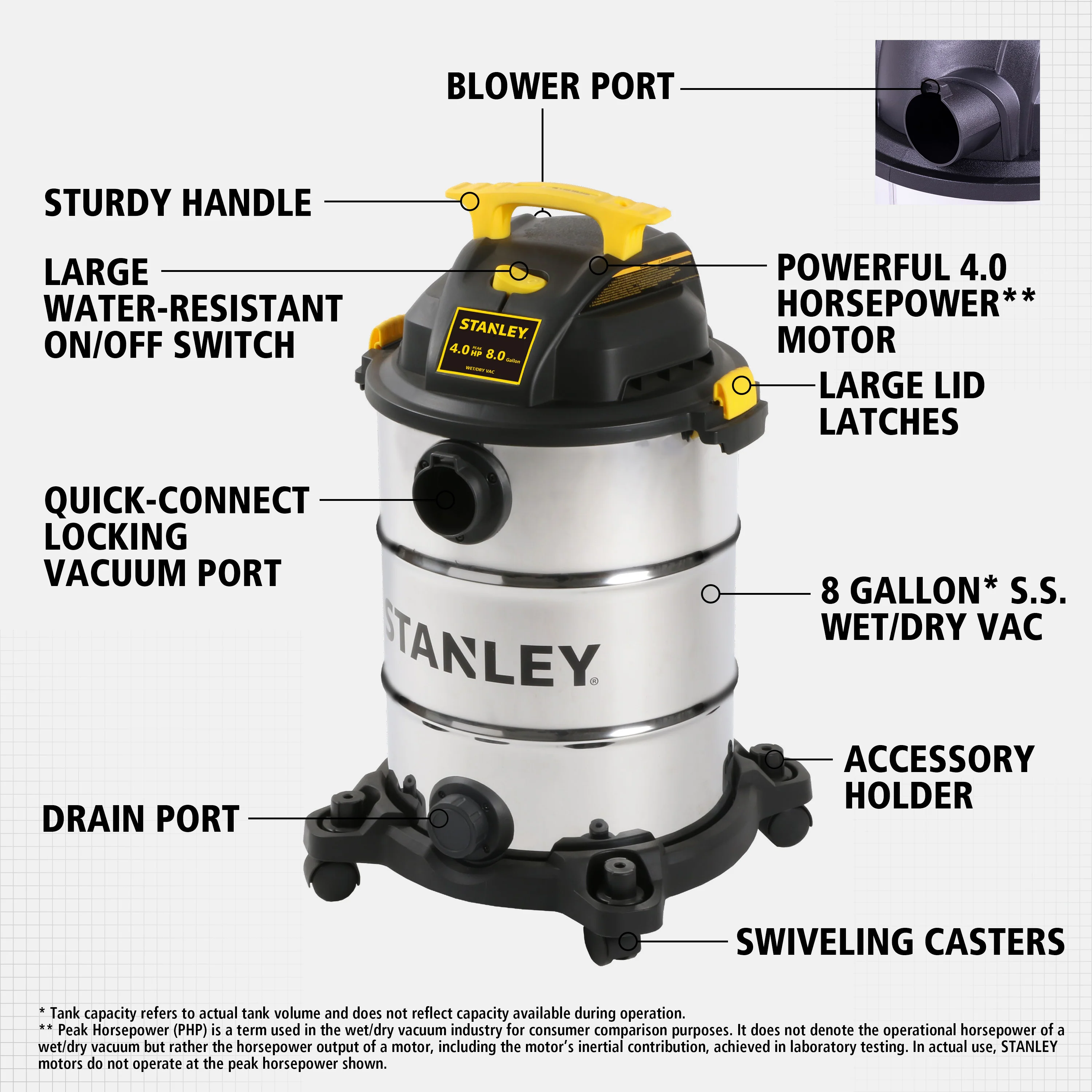 The Stanley stainless steel 8-gallon* wet/dry vacuum features a powerful motor for industry leading performance, providing maximum suction power for heavy-duty pickup. Great for both wet and dry pickups. The powerful blower port instantly converts the wet/dry vacuum into a power blower. Strong handle for easy carrying. Large on/off switch with water-resistant design for safe and quick access. Convenient, built-in power cord wrap. Accessory storage casters keep your tools organized and provide ease of movement in any direction. Built-in tank drain makes draining easy. Stanley wet/dry vacuums provide superior performance in any environment. From a portable wall-mounted 1-gallon*, 1.5 peak HP** wet/dry vacuum great for a variety of clean-up tasks in any room at home and the garage to the rugged 14-gallon*, 6.5 peak HP** stainless steel wet/dry vacuum for heavy-duty use, Stanley wet/dry vacuums make short work of even the toughest jobs, saving you time and effort. Includes a 1-year limited warranty. Extended warranties available.